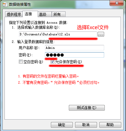 3. “连接”选项卡页面,选择数据库或输入数据库名称中,选择你要导入的 EXCEL 文件。“允许保存密码”,打对勾。