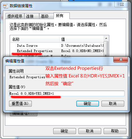 修改“Extended Properties”的属性值为“Excel 8.0;HDR=YES;IMEX=1”。(这一步至关重要)