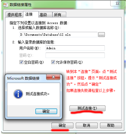 5. 顶部选项卡切换到“连接”页面,点“测试连接”按钮,测试连接成功后,按“确定”按钮。创建连接字符串完成。如果测试连接失败,重新检查以上步骤,每一步都不能少。