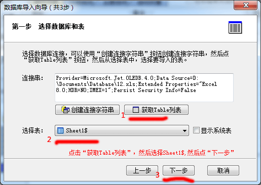 6. 点“获取Table 列表”按钮,然后选择 Sheet1$,也就是第一个 Sheet。