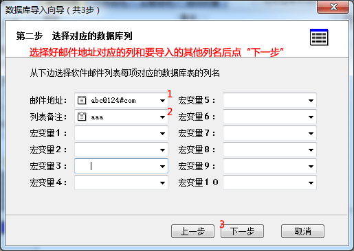 7. 选择好邮件地址对应的列名,选择好其他内容对应的列(列名中一般会包含Excel 表格中第一行的内容,以便容易知道这一列是做什么的”。其他内容可以放入列表备注,也可以放入宏1-10种,任意选择。选择后按“下一步”按钮。如果列名是F1、F2... 这种F加数字的,F后边的数字就是指第几列。