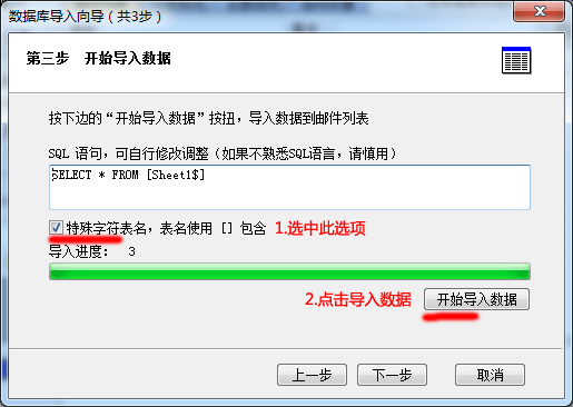 8. 选中“特殊字符表名”,然后按“开始导入数据”按钮,即可导入 Excel 表中的邮件地址了。